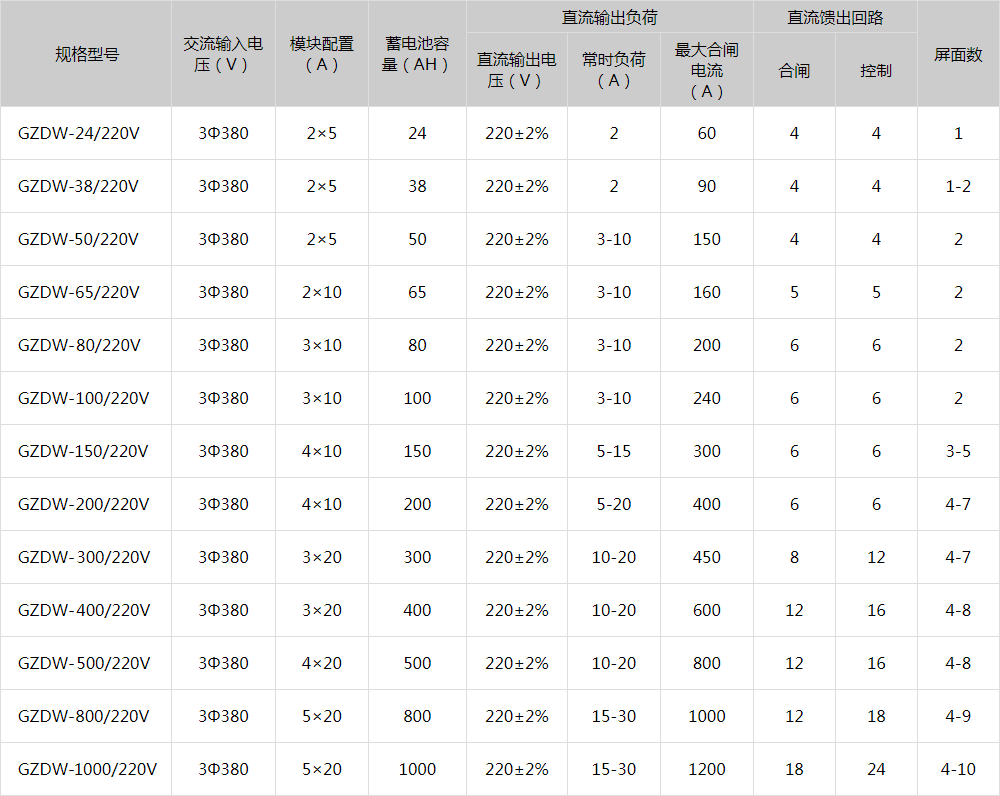 GZDW系列高頻開關(guān)直流電源主要技術(shù)參數(shù)表